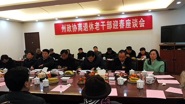 2月5日上午,州政协召开机关离退休老同志迎春座谈会。州政协主席刘昌刚主持会议并讲话,州政协副主席贾高飞、宋清宏、向顶天、龙春生、石红、秘书长张旭以及机关离退休老同志参加会议。