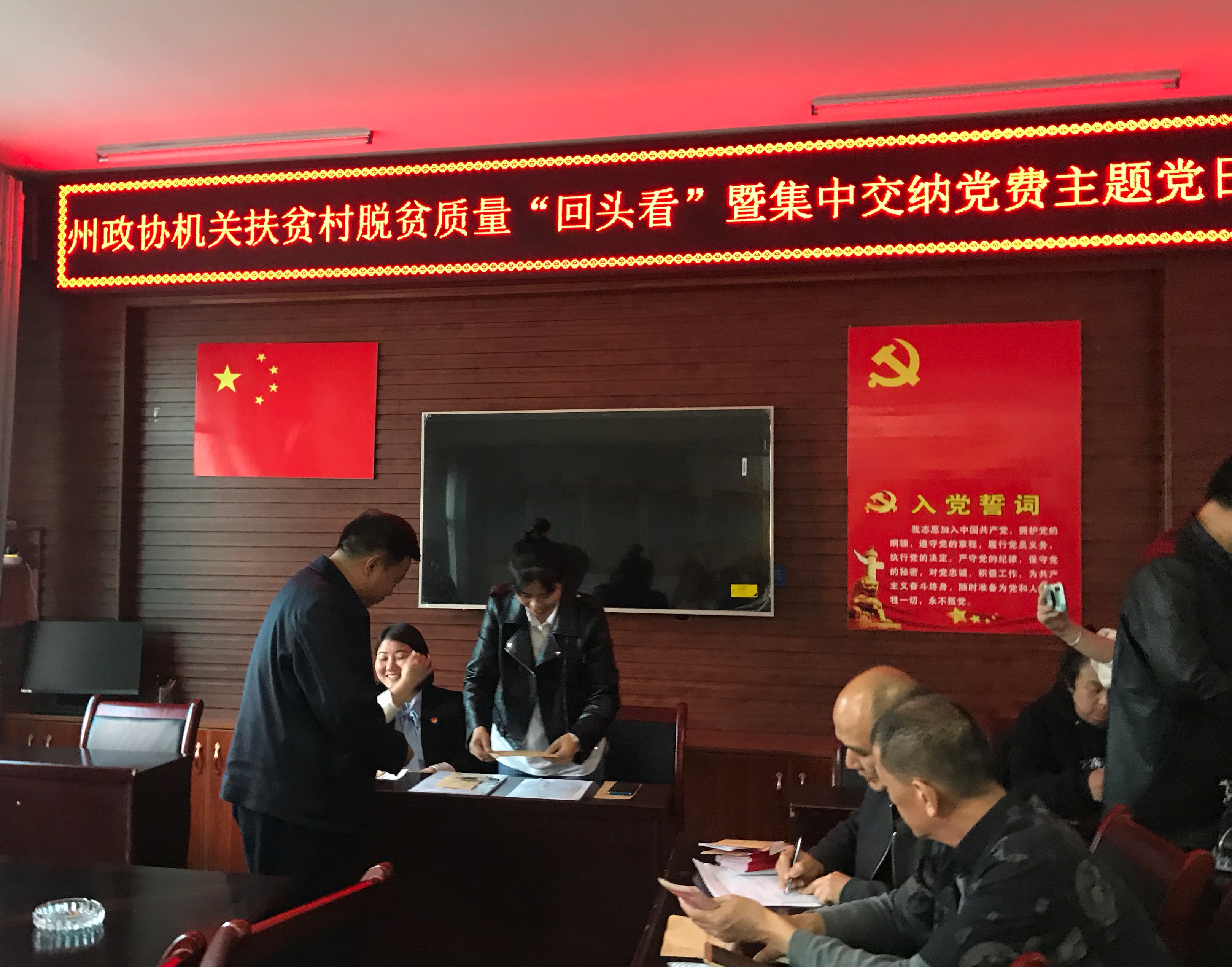 4月16日下午,在州政协机关联系的扶贫村所在的龙山县民安街道办事处会议室,州政协机关办公室、专委会党支部全体党员开展了一次特殊的集中交纳党费主题党日。